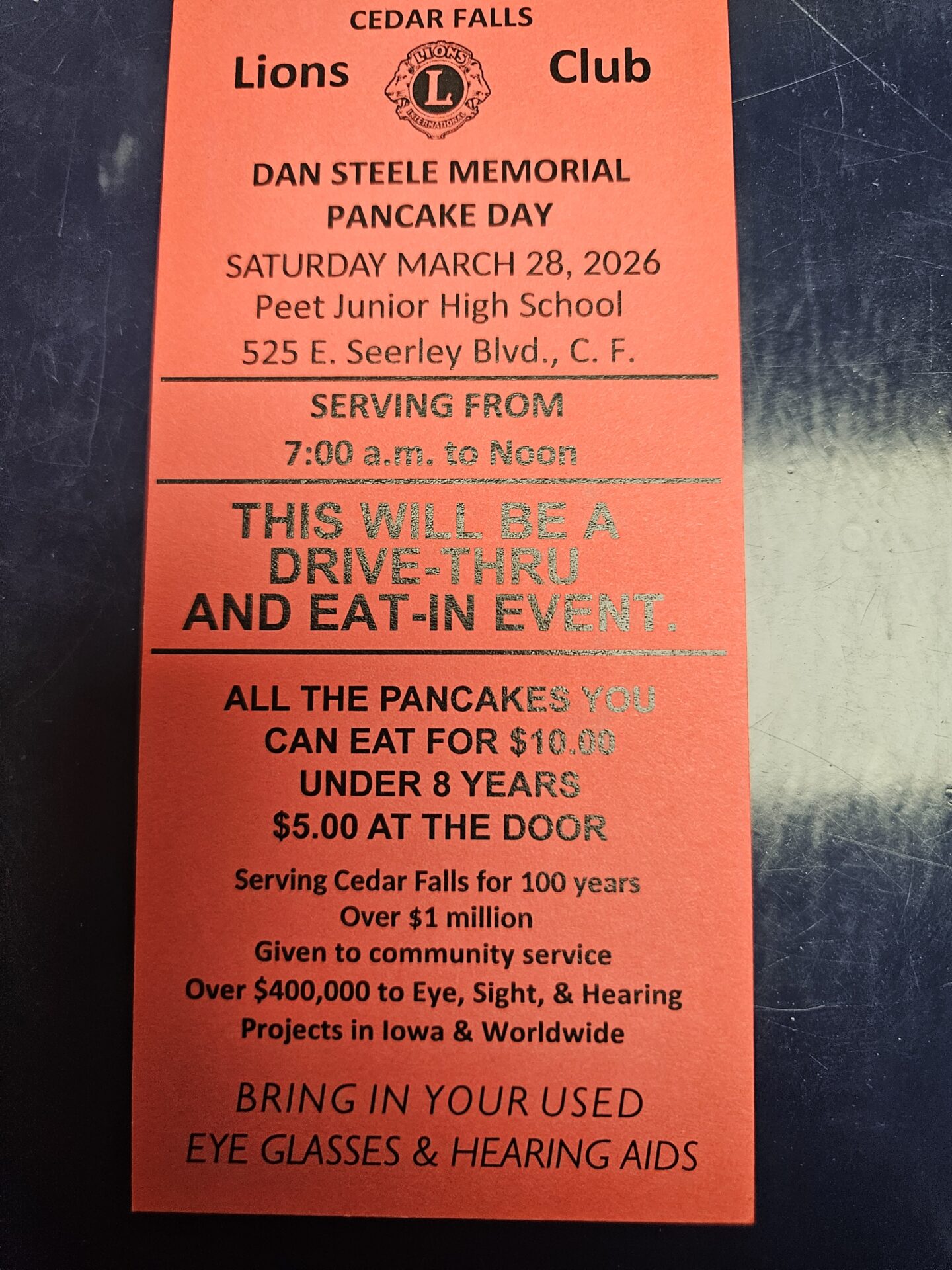 The Cedar Falls Lions' Club annual Dan Steele Memorial Pancake Day is Saturday March 28th, at Peet Junior High School in Cedar Falls. Serving from 7AM to Noon. All the …